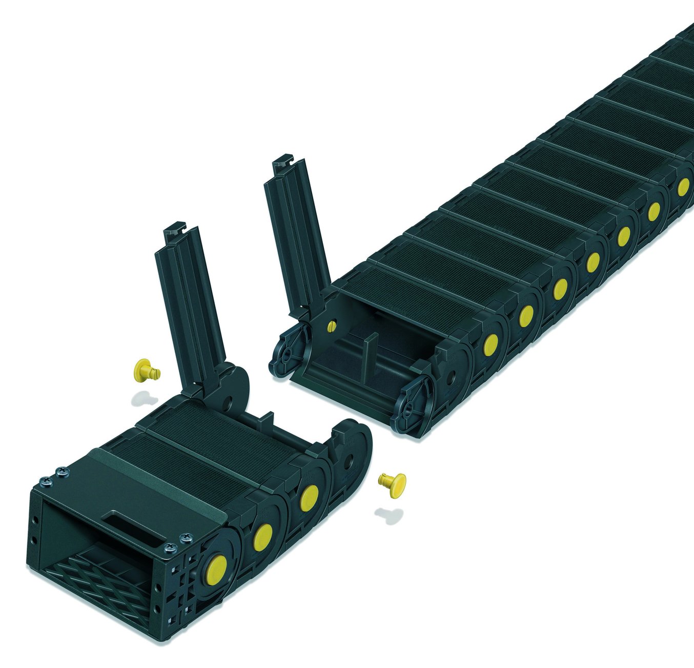 Полностью закрытые цепи для экстремальных условий эксплуатации (напр. металлические стружки). Каждое звено цепи оснащено откидной крышкой для быстрого монтажа или замены проложенных кабелей или шлангов.