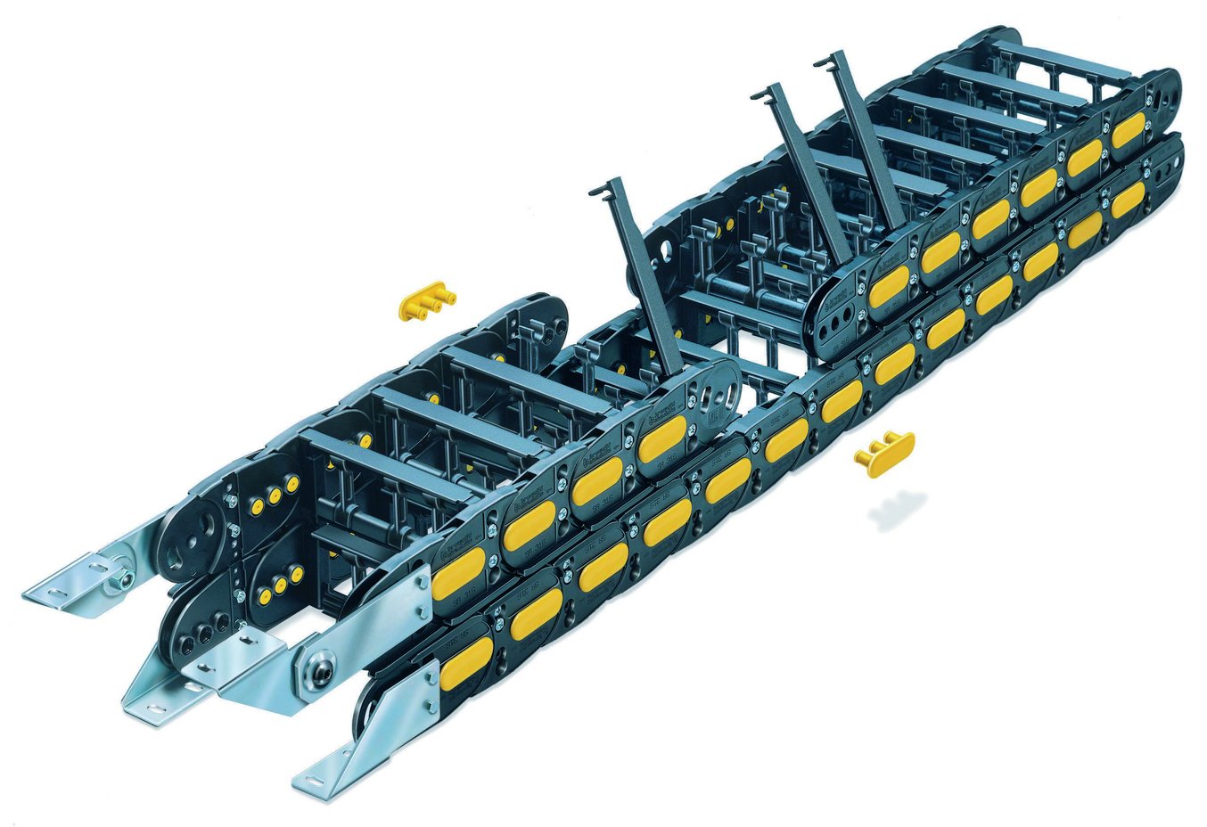 Для монтажа цепи необходимо использовать желоба и направляющие каналы. Также предлагается большой выбор вертикальных и горизонтальных перегородок из полиамида и алюминия.