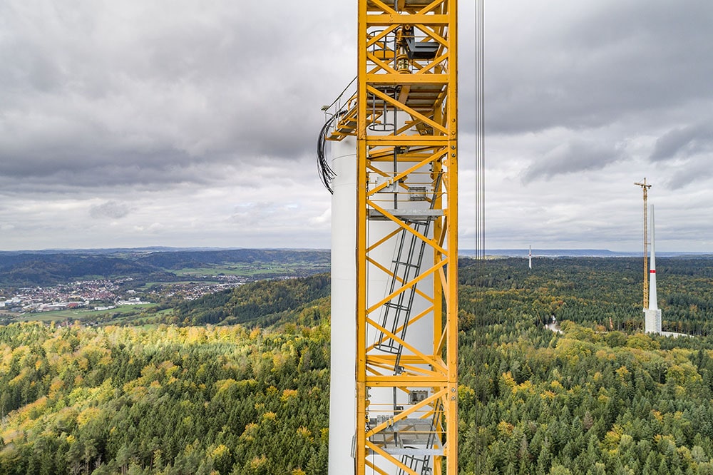 Масштаб впечатляет: башня до небес с подъемным краном, будто парящие в сотне метров над землей, едва различимы в облаках над Лимпургскими холмами. Лучшее место для ветряной электростанции трудно представить. Фотографии в этой статье сделаны незадолго до установки на вершине башни гондолы генератора с тремя лопастями воздушного винта. Энергию ветра они преобразуют в 3.4 МВт электрической мощности. Проект турбины предполагает выработку более 10 ГВт электроэнергии в год, что достаточно для обеспечения нужд около 2500 семей из 4 человек. Три другие установки похожей конструкции и мощности возвышаются словно часовые на холме в паре сотен метров друг от друга.
